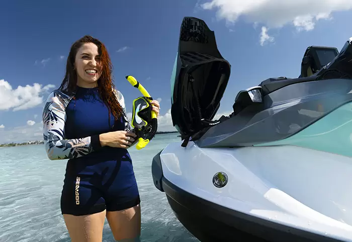 Mantém todos os recursos exclusivos Sea-Doo, como sistema de freio e ré inteligente (iBR), controle de aceleração iTC, sistema de redução de ruído D-Sea-Bel e ampla plataforma de popa com engate rápido LinQ.